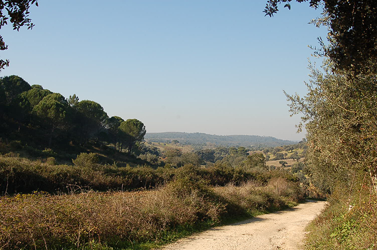 prossegue por campos de cultivo e explorações agroflorestais até chegar à